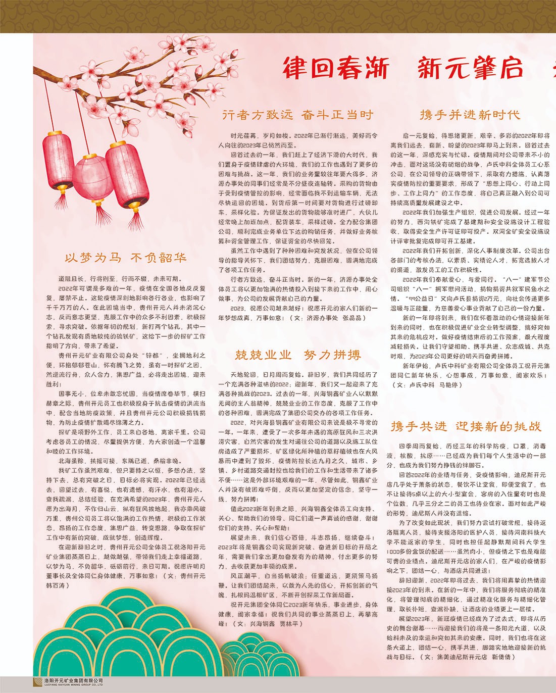 洛陽開元礦業(yè)集團(tuán)有限公司簡(jiǎn)介洛陽開元礦業(yè)集團(tuán)有限公司,始成立于2006年,位于洛陽市開元大道269號(hào)。集團(tuán)旗下共有五余家全資子公司,業(yè)務(wù)涉及有色金屬礦山開發(fā)、礦產(chǎn)品購銷與進(jìn)出口貿(mào)易、房地產(chǎn)開發(fā)、文化藝術(shù)、企業(yè)管理與咨詢、資本投資等多個(gè)領(lǐng)域。民建河南省委委員、民建河南省委企業(yè)委副主任、民建洛陽市委委員、企業(yè)委主任、洛陽民建企業(yè)家協(xié)會(huì)會(huì)長許明月是公司創(chuàng)始人,現(xiàn)任洛陽開元礦業(yè)集團(tuán)有限公司董事長。在礦業(yè)領(lǐng)域,洛陽開元礦業(yè)集團(tuán)擁有多家實(shí)力雄厚的子公司:貴州開元礦業(yè)有限公司探、采礦權(quán)面積共11.33平方公里;興海縣銅鑫礦業(yè)有限公司探礦權(quán)面積8.76平方公里,礦山資源潛力巨大;2021年,開元集團(tuán)與盧氏中科礦業(yè)有限公司開展戰(zhàn)略合作。盧氏中科礦業(yè)有限公司專注于有色金屬的浮選、加工和銷售,擁有強(qiáng)大的技術(shù)支撐平臺(tái),是集探、采、選、冶、研為一體的中大型綜合礦業(yè)企業(yè)。目前,盧氏中科王家河1000噸選礦廠已成功投產(chǎn),雙河金礦、柳關(guān)欒盧鉛鋅礦相繼順利開工,樓房銀礦與圪老灣鉛鋅礦的深部探礦重大突破,標(biāo)志著礦山版圖取得重大進(jìn)展,為開元集團(tuán)后續(xù)發(fā)展奠定了堅(jiān)實(shí)基礎(chǔ)。在文化傳媒領(lǐng)域,洛陽市明月美術(shù)館通過豐富多樣的藝術(shù)展覽、學(xué)術(shù)研討和公共教育活動(dòng),努力打造一個(gè)集展覽、交流、教育、研究為一體的綜合性藝術(shù)平臺(tái)。此外,在金融投資領(lǐng)域,開元集團(tuán)旗下的北京明峰資本管理有限公司專注于投資具有高增長潛力的優(yōu)秀企業(yè),特別是高科技、新能源、環(huán)保等新興產(chǎn)業(yè),為客戶提供個(gè)性化的資產(chǎn)配置服務(wù)。在做好企業(yè)經(jīng)營的同時(shí),開元集團(tuán)始終不忘企業(yè)的社會(huì)責(zé)任和家國情懷,以突出的愛心公益事跡,開展了一系列公益慈善活動(dòng):“民建林”公益事業(yè)通過“思源基金”“幫幫公益”線上公益平臺(tái),與眾多愛心人士籌措資金20余萬元;資助541名貧困大學(xué)生共計(jì)270余萬元,推進(jìn)“數(shù)字助力——河南AI人才培養(yǎng)”;捐款10萬元,馳援京津冀、黑龍江洪水地質(zhì)災(zāi)害……公司于2017年底被洛陽市慈善總會(huì)評(píng)為“洛陽慈善風(fēng)云榜——十大愛心集體”。洛陽開元礦業(yè)集團(tuán)有限公司秉承持續(xù)發(fā)展理念,憑借多年來良好的企業(yè)信譽(yù)與經(jīng)營業(yè)績,與全國多家企業(yè)建立了良好合作關(guān)系,受到社會(huì)各界的一致好評(píng),多次榮獲“納稅標(biāo)兵”“先進(jìn)企業(yè)”“招商引資模范企業(yè)”等榮譽(yù)稱號(hào)?;赝麃頃r(shí)路,開元人勠力同心,以“闖”的精神和“創(chuàng)”的勁頭,一路披荊斬棘,踏過千山萬水;展望新未來,開元人凝心聚力,不執(zhí)于“舊”,無畏于“新”,秉承“勇于跨越,追求卓越”的企業(yè)精神,乘著國家高質(zhì)量發(fā)展新征程的東風(fēng),跨過高山,越過大海,向著集團(tuán)多元化、國際化的目標(biāo),逐夢(mèng)遠(yuǎn)航,跨越前行!