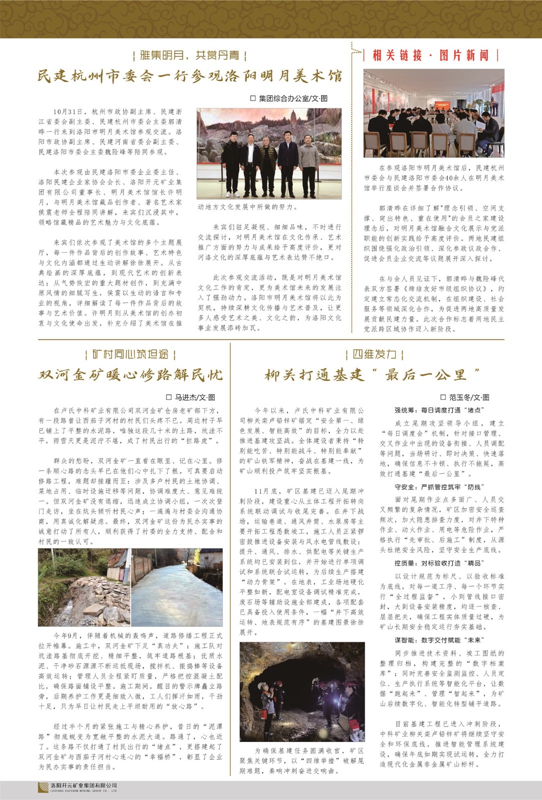 洛陽開元礦業(yè)集團(tuán)有限公司簡介洛陽開元礦業(yè)集團(tuán)有限公司,始成立于2006年,位于洛陽市開元大道269號。集團(tuán)旗下共有五余家全資子公司,業(yè)務(wù)涉及有色金屬礦山開發(fā)、礦產(chǎn)品購銷與進(jìn)出口貿(mào)易、房地產(chǎn)開發(fā)、文化藝術(shù)、企業(yè)管理與咨詢、資本投資等多個領(lǐng)域。民建河南省委委員、民建河南省委企業(yè)委副主任、民建洛陽市委委員、企業(yè)委主任、洛陽民建企業(yè)家協(xié)會會長許明月是公司創(chuàng)始人,現(xiàn)任洛陽開元礦業(yè)集團(tuán)有限公司董事長。在礦業(yè)領(lǐng)域,洛陽開元礦業(yè)集團(tuán)擁有多家實力雄厚的子公司:貴州開元礦業(yè)有限公司探、采礦權(quán)面積共11.33平方公里;興??h銅鑫礦業(yè)有限公司探礦權(quán)面積8.76平方公里,礦山資源潛力巨大;2021年,開元集團(tuán)與盧氏中科礦業(yè)有限公司開展戰(zhàn)略合作。盧氏中科礦業(yè)有限公司專注于有色金屬的浮選、加工和銷售,擁有強大的技術(shù)支撐平臺,是集探、采、選、冶、研為一體的中大型綜合礦業(yè)企業(yè)。目前,盧氏中科王家河1000噸選礦廠已成功投產(chǎn),雙河金礦、柳關(guān)欒盧鉛鋅礦相繼順利開工,樓房銀礦與圪老灣鉛鋅礦的深部探礦重大突破,標(biāo)志著礦山版圖取得重大進(jìn)展,為開元集團(tuán)后續(xù)發(fā)展奠定了堅實基礎(chǔ)。在文化傳媒領(lǐng)域,洛陽市明月美術(shù)館通過豐富多樣的藝術(shù)展覽、學(xué)術(shù)研討和公共教育活動,努力打造一個集展覽、交流、教育、研究為一體的綜合性藝術(shù)平臺。此外,在金融投資領(lǐng)域,開元集團(tuán)旗下的北京明峰資本管理有限公司專注于投資具有高增長潛力的優(yōu)秀企業(yè),特別是高科技、新能源、環(huán)保等新興產(chǎn)業(yè),為客戶提供個性化的資產(chǎn)配置服務(wù)。在做好企業(yè)經(jīng)營的同時,開元集團(tuán)始終不忘企業(yè)的社會責(zé)任和家國情懷,以突出的愛心公益事跡,開展了一系列公益慈善活動:“民建林”公益事業(yè)通過“思源基金”“幫幫公益”線上公益平臺,與眾多愛心人士籌措資金20余萬元;資助541名貧困大學(xué)生共計270余萬元,推進(jìn)“數(shù)字助力——河南AI人才培養(yǎng)”;捐款10萬元,馳援京津冀、黑龍江洪水地質(zhì)災(zāi)害……公司于2017年底被洛陽市慈善總會評為“洛陽慈善風(fēng)云榜——十大愛心集體”。洛陽開元礦業(yè)集團(tuán)有限公司秉承持續(xù)發(fā)展理念,憑借多年來良好的企業(yè)信譽與經(jīng)營業(yè)績,與全國多家企業(yè)建立了良好合作關(guān)系,受到社會各界的一致好評,多次榮獲“納稅標(biāo)兵”“先進(jìn)企業(yè)”“招商引資模范企業(yè)”等榮譽稱號?;赝麃頃r路,開元人勠力同心,以“闖”的精神和“創(chuàng)”的勁頭,一路披荊斬棘,踏過千山萬水;展望新未來,開元人凝心聚力,不執(zhí)于“舊”,無畏于“新”,秉承“勇于跨越,追求卓越”的企業(yè)精神,乘著國家高質(zhì)量發(fā)展新征程的東風(fēng),跨過高山,越過大海,向著集團(tuán)多元化、國際化的目標(biāo),逐夢遠(yuǎn)航,跨越前行!